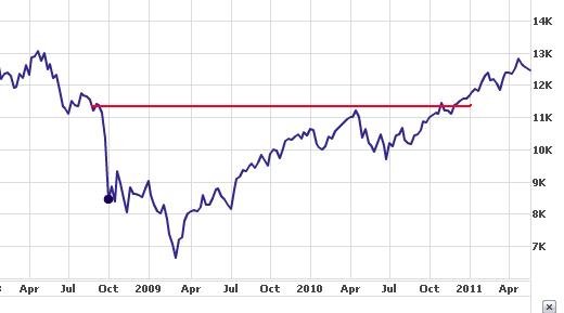 या उलट १५ सप्टें. २००८ या दिवशी ११,३८८ ला असणार्या Dow Jones या अमेरीकन शेअर बाजार निर्देशांकास पुन्हा मुळस्थिती प्राप्त करण्यास नोव्हें २०१० म्हणजे तब्बल २० महिने लागले.